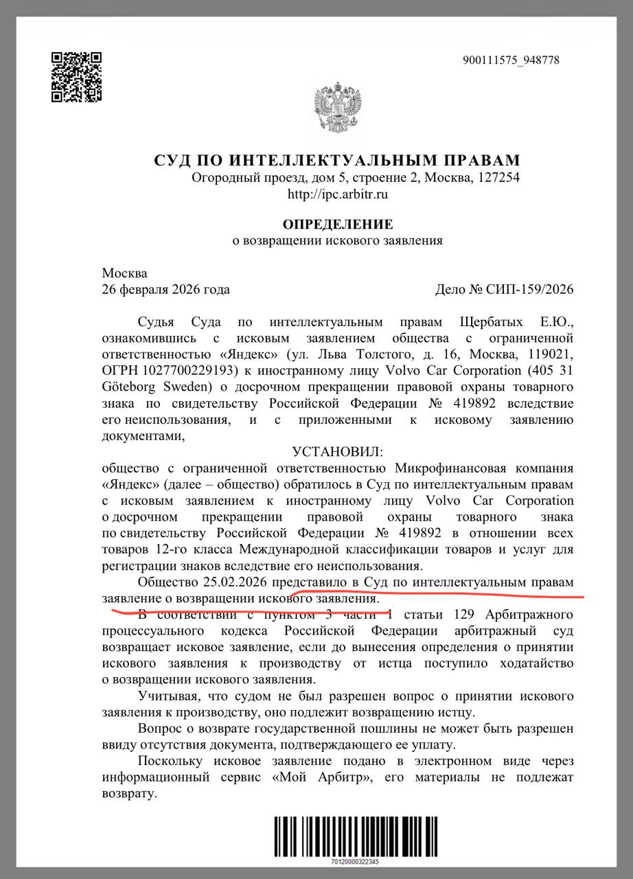 🤓Яндекс подал в суд на Volvo и хотел досрочно прекратить действие товарного знака № 419892 (Драйв). Но почти сразу сам же передумал и попросил вернуть иск.