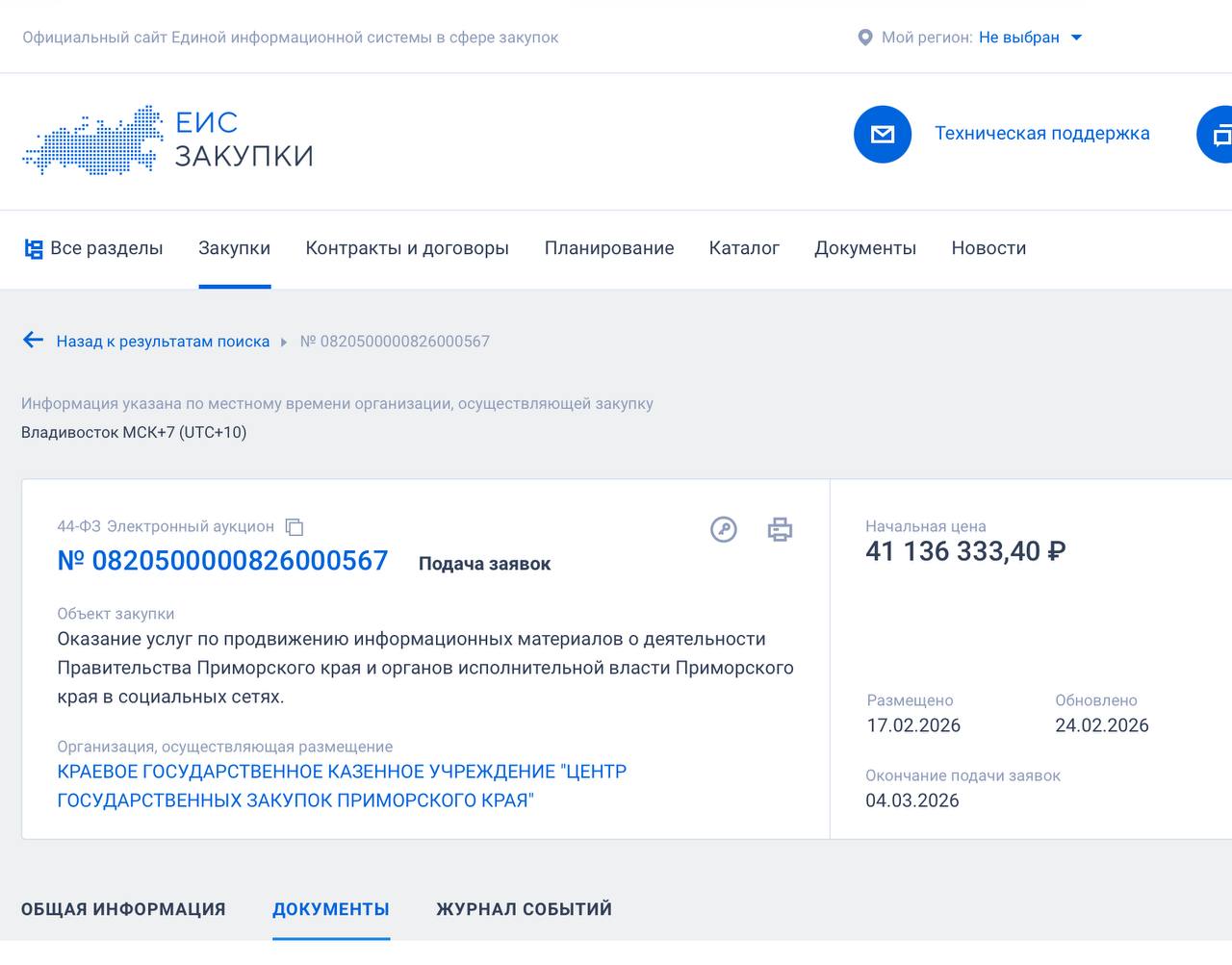 По данным карточки аукциона, край готов потратить на рекламу своей деятельности в 2026 году более 41 миллиона рублей. Контракт предусматривает размещение материалов о работе правительства и региональных органов власти в социальных сетях. Но в документации указаны только Telegram-каналы, как федеральные, так и дальневосточные.