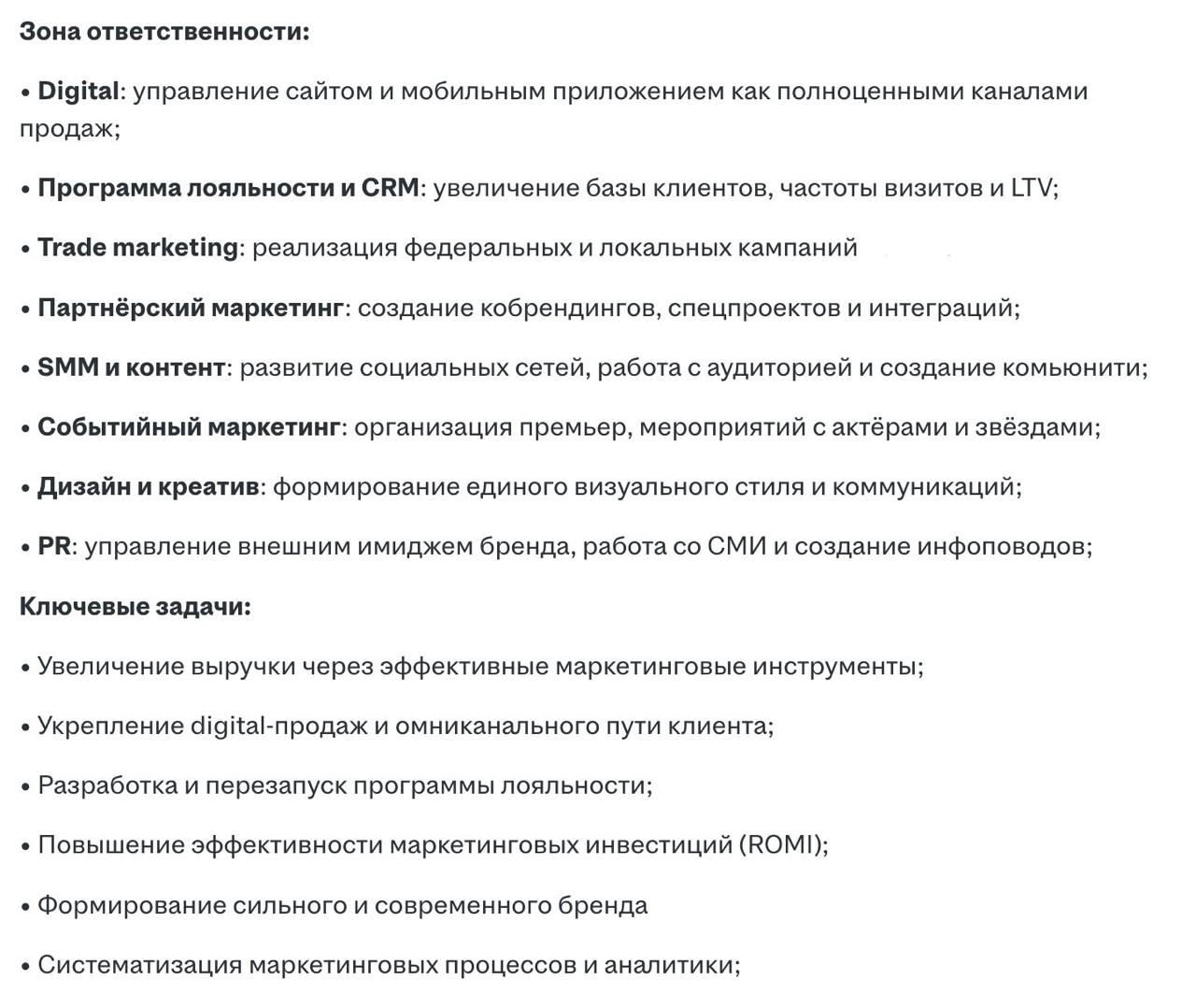 Смотрите: работодатель ищет руководителя функции маркетинга. Из функционала вакансии видно — интересных финансовых потоков на позиции не предусмотрено. Все способы «развития клиентской базы» относятся к партнерским каналам, CRM и малобюджетному SMM с PR. Короче, копейки.
