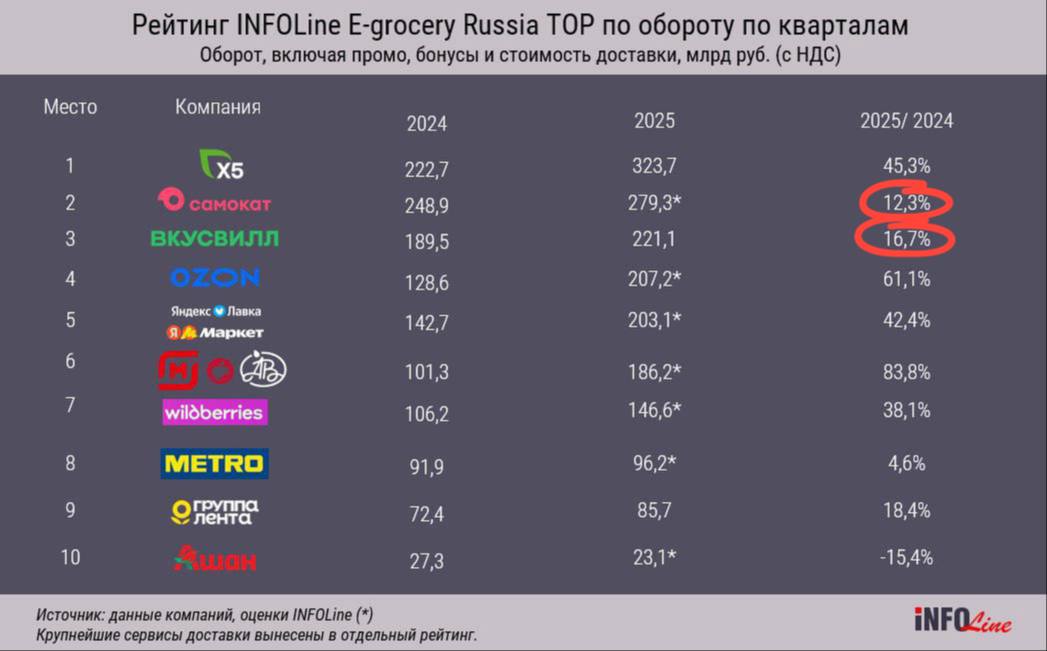 🤓Вы удивитесь, но по данным Infoline оборот доставки Вкусвилла и Самоката не растет, а стоит на месте или даже падает (если учитывать инфляцию в продуктовых категориях). Интересно почему?