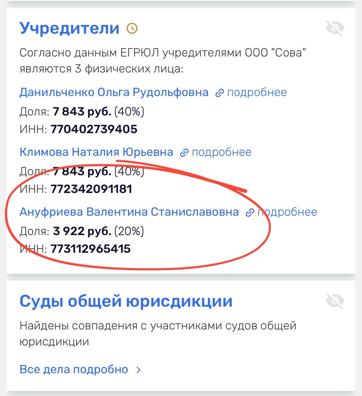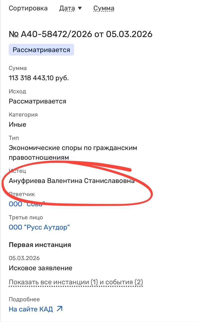 🤔Загадочное событие. Действующий учредитель агентства «Сова» Ануфриева Валентина Станиславовна подала судебный иск к собственному юрлицу на сумму 113 миллионов рублей. Третьим лицом в иске выступает РУСС.