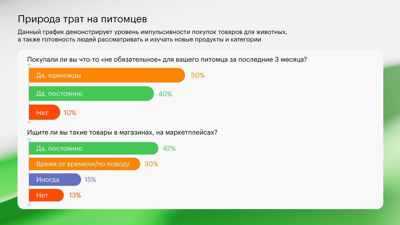 Если говорить об экономике «пет-родительства»: более 55% покупок для питомцев — импульсивные, до 35% респондентов отмечают дефицит «дофаминовых» новинок; в кормах даунтрейдинг выражен почти на 30% меньше/реже, чем в еде «для себя», а экономия на питомце обычно не входит даже в топ-25 статей сокращения расходов.