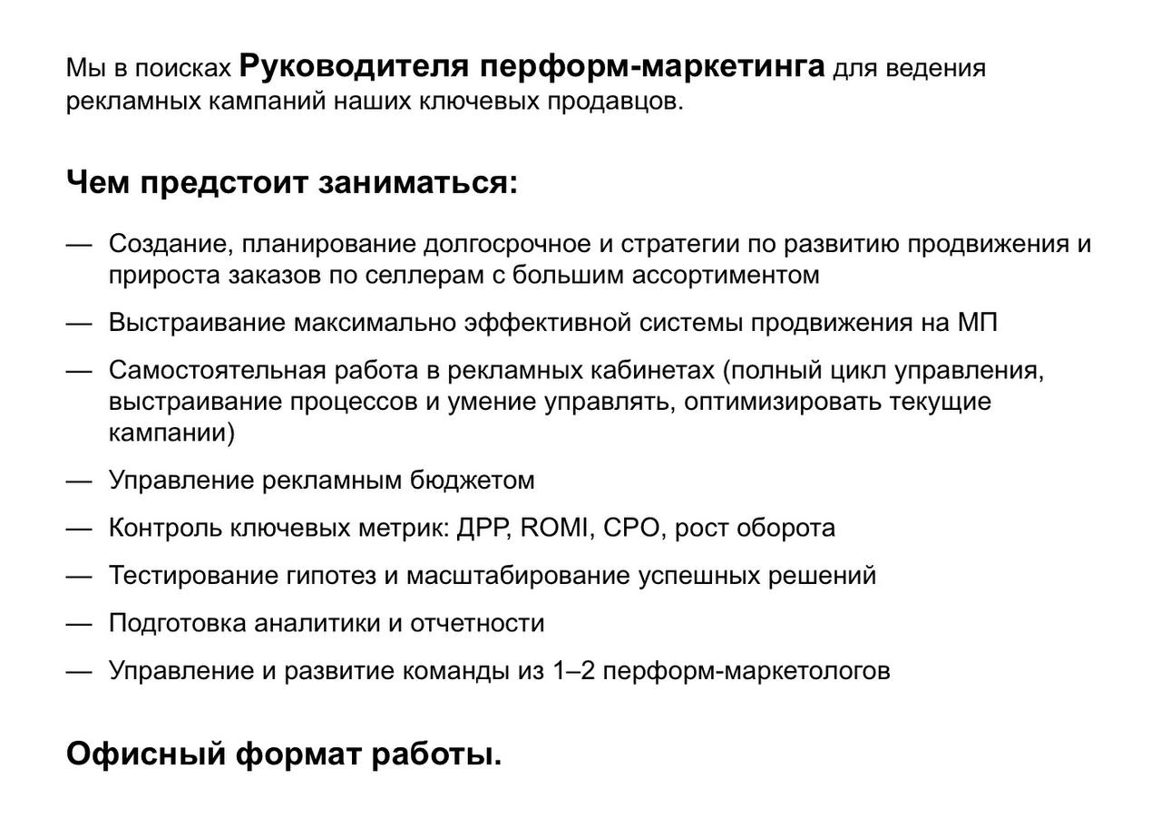 🤔У Вайлдберриз жирнейшая вакансия — руководитель перформанс-маркетинга. Один недостаток — следить за расходованием бюджета, полагаем, будут строго.