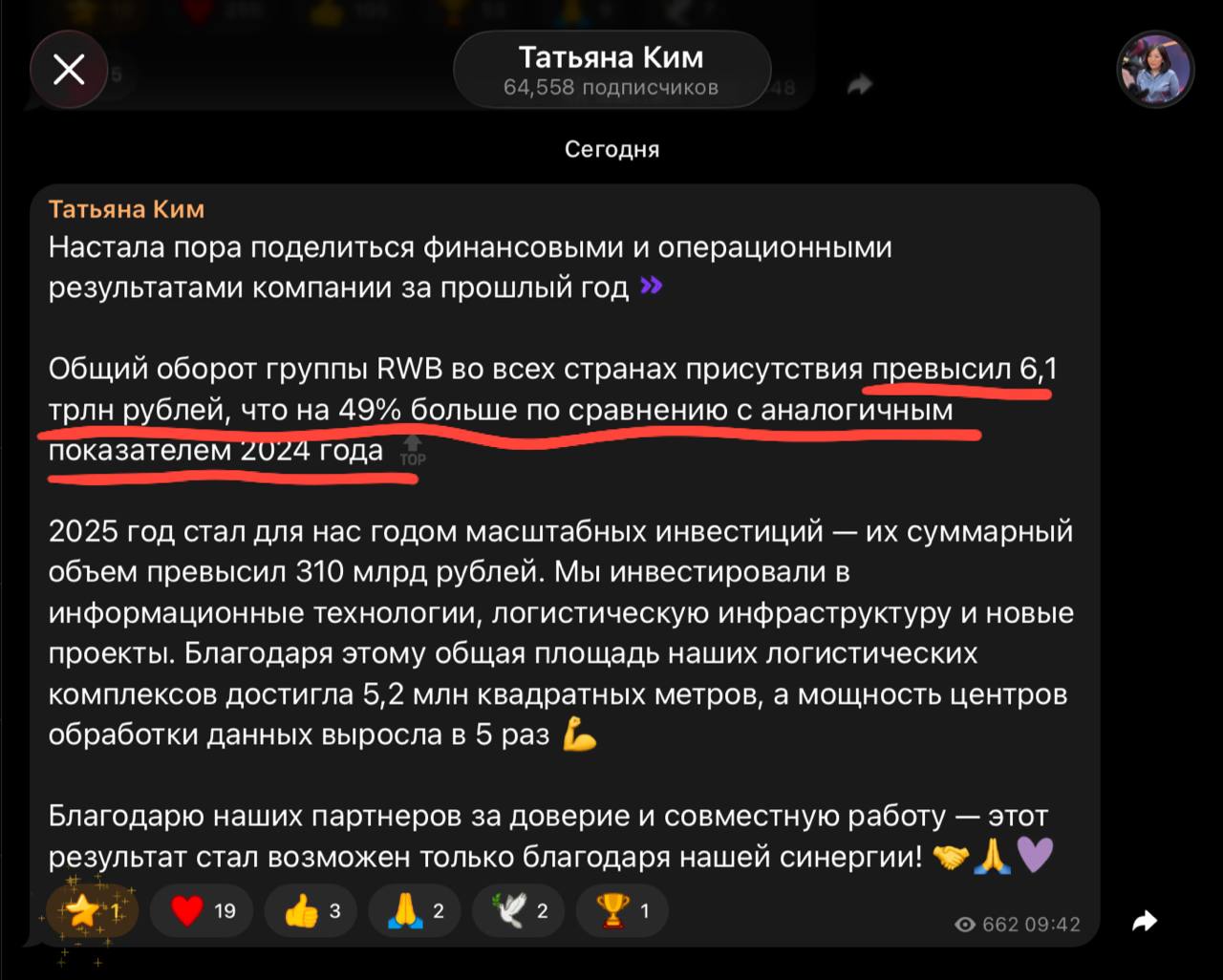 🤓Цена вопроса — 6,1 триллиона. Фиксируем в блокноте.Оборот WB в 2025 году, по словам Татьяны Ким. Рост год к году — 49%.
