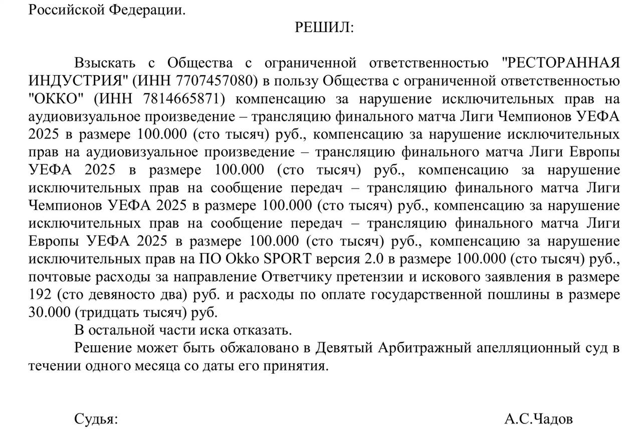 Размер компенсации, заявленный стримингом, суд посчитал завышенным, ведь спортбар преступил закон впервые и, к тому же, хотел подписать лицензионное соглашение. В итоге вместо 2,5 млн рублей ООО “Ресторанная индустрия” заплатит ООО “Окко” только 500 тысяч, а также компенсирует расходы на оплату госпошлины в размере 30 тысяч рублей и на доставку претензии и иска Почтой России в размере 192 рублей. Решение не вступило в законную силу.