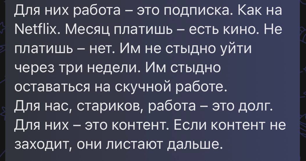 🤓Шикарное про «зумеров». Работа — это подписка. Признаться, мы не видим в этом ничего плохого. Меняются поколения, изменяется культура труда. Нам кажется, это прекрасно.