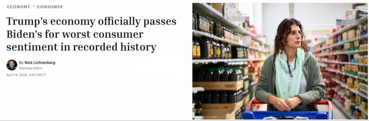 🤓В США тоже закат потребления. Индекс потребительских настроений, который рассчитывает на регулярной основе University of Michigan, упал до рекордно низкого уровня — 47,6 в апреле 2026 года. Такой уровень даже хуже показателей экономики Джо Байдена в 2022 году.