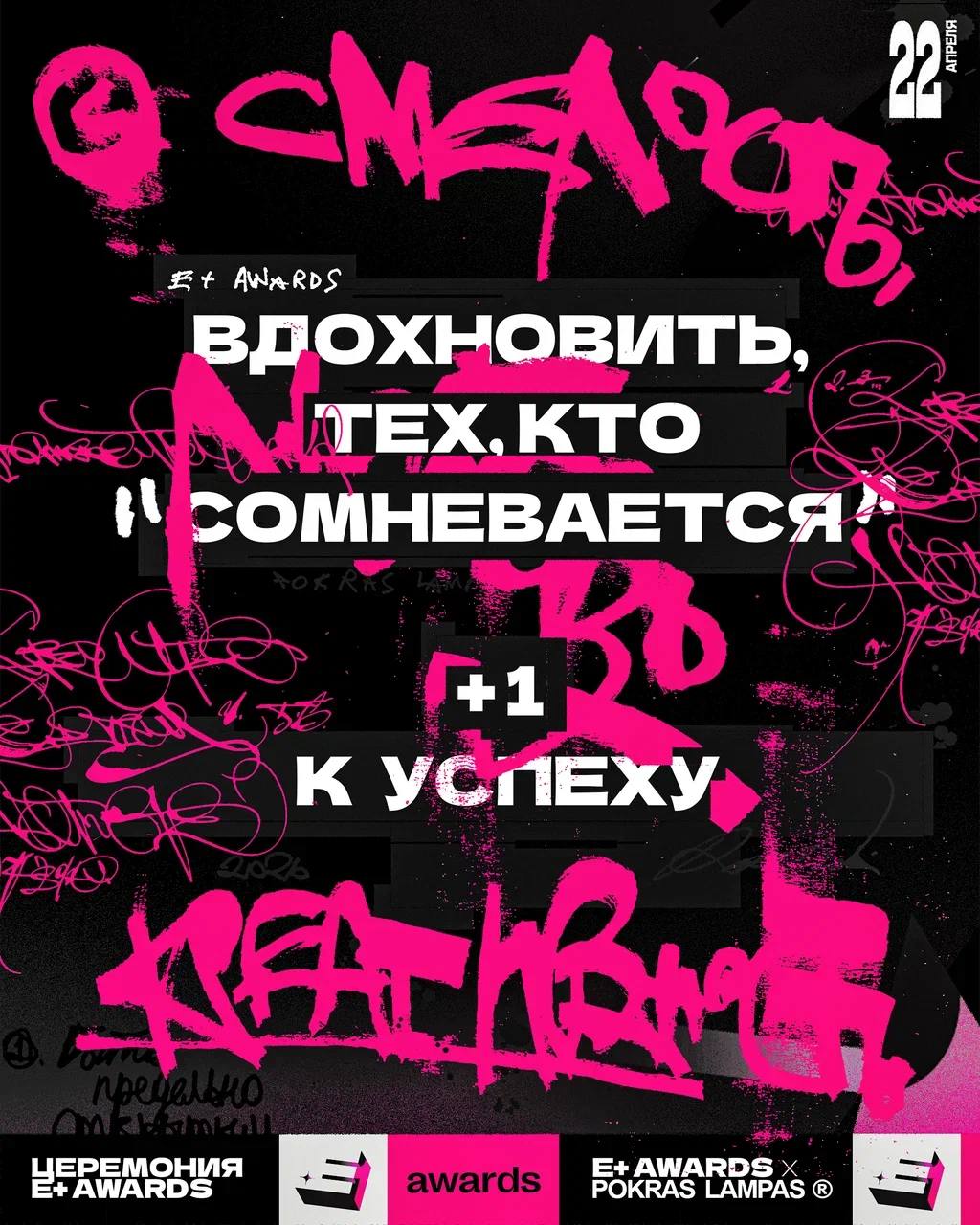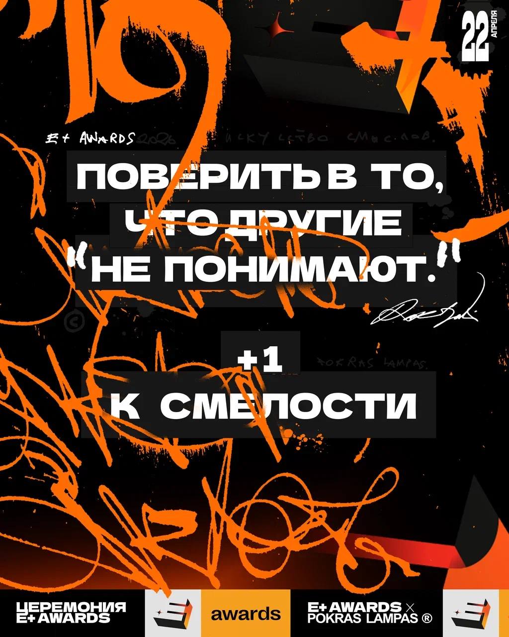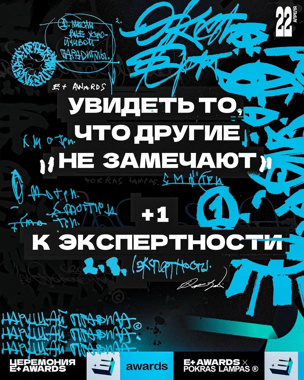 🤓 Уже завтра состоится церемония награждения премии E+ Awards. На ней вас ждут два сюрприза. Первый — художник-каллиграфутурист Покрас Лампас, который выступит на сцене и покажет кое-что особенное. Второй увидят только те, кто придет завтра на церемонию. Спойлер — наши фанатки могут занимать первые ряды.